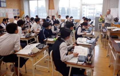 5月28日(火) 3限 3−Aの技術の授業風景です。先生の話術に引き込まれています。