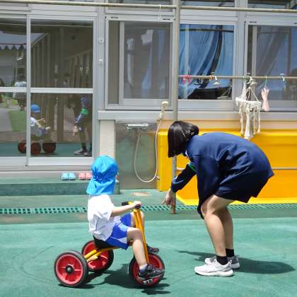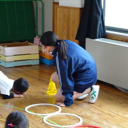 「社会に学ぶ『14歳の挑戦』」なでしこ保育園 公開日 2024/05/29 更新日 2024/05/29 芝園の一日 5月29日(水) 体育の活動で先生の補助をしている様子と、園庭で園児といっしょに遊んでいる様子です。
