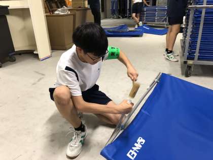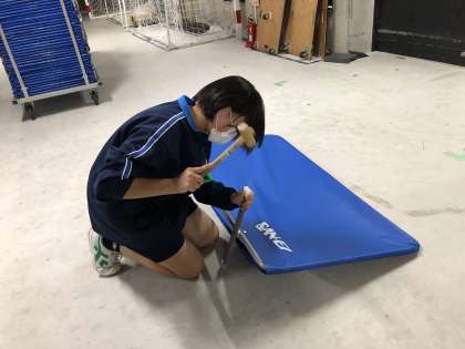 妨球フェンスの修理をしています。
