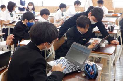 1−Bの社会の授業風景です。「都道府県と都道府県の県庁には、どんな特色があるか」という課題で学習しています。まずは、それぞれの似ている点と相違点という観点で、情報を集めています。