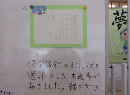 3学年のフロアには、修学旅行でお世話になったタクシー会社から届いたお手紙が掲示してあります。その手紙には