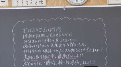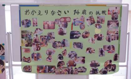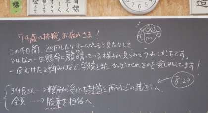 2年生は、先週「社会に学ぶ『14歳の挑戦』」を終えて、久しぶりに登校しました。教室の黒板には担任からのメッセージが書かれていました。また、学年フロアの掲示板には、活動の様子を写真で掲示してあります。2年生のみなさん、お疲れさまでした。