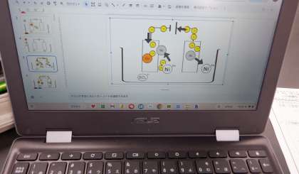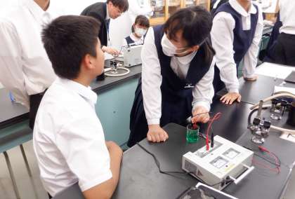 生徒は先生が提示した課題に「どうなるかな?」「電子はどうやって移動するのか?」等、熱心に集中して考えていました。休み時間まで議論している姿に、お褒めの言葉もいただきました。3年生、頑張ったね!