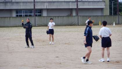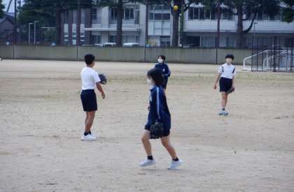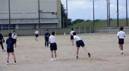 3−Aの体育の授業風景です。3年生の体育では、ソフトボールをしています。おや?先生も一緒に活動、楽しそうですね。