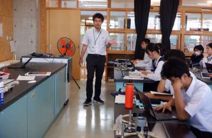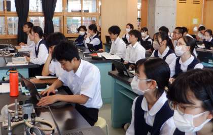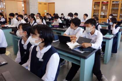 3−Aの理科の授業風景です。実験の確認をしています。先生の説明を、目と目をつないで集中し絵聞いています。さすが、3年生!