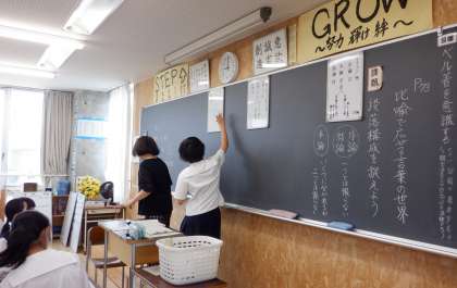 1−Aの国語の授業風景です。「比喩で広がる言葉」の教材で、文章の読み方を学習しています。