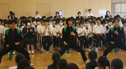 壮行会を行いました その8 公開日 2024/06/11 更新日 2024/06/11 芝園の一日 6月11日(火) 壮行会の最後に「芝中応援団」が、選手に熱いエールを送りました。 大会はいよいよ14日から始まります。「平常心」と「あきらめない心」で、芝園プライドをもって戦い抜いてきてください。健闘を祈る!