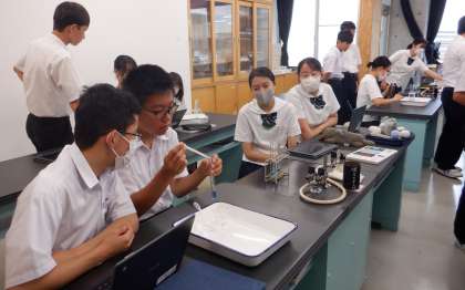 6月18日(火) 2限 3−Bの理科の授業風景です。中和の実験です。BTB溶液の色の変化に興味津々です。