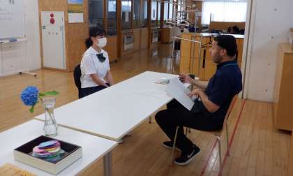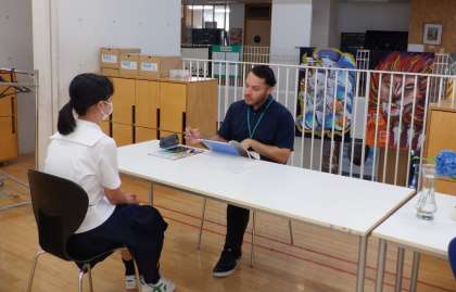 2−Aの英語の授業風景です。ALTの先生に、英語で伝えています。ちょっぴり緊張気味かな〜