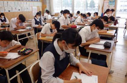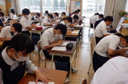 3−Cの理科の授業風景です。学習した内容を、プリントで確認しています。集中していますね!