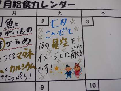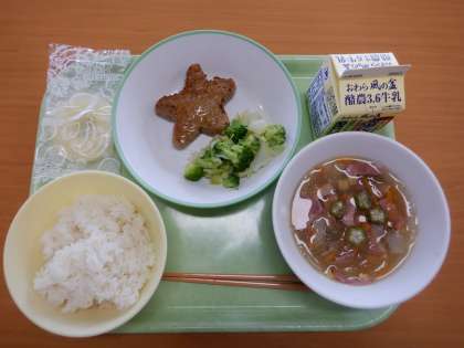 今日は「七夕献立」です。星形ハンバーグはもちろん、天の川スープには星に見立てたオクラやはるさめが入っていました。七夕が待ち遠しいですね。