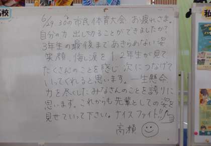 温かなメッセージ 3学年 公開日 2024/07/02 更新日 2024/07/02 芝園の一日 7月2日(火) 市民体育大会が終わり、3年生の中にはこれで部活動を引退する生徒もいます。学年フロアには、学年主任から3年生へのメッセージが書かれていました。これで部活動を引退する3年生の皆さん、本当によく頑張ったね。お疲れさま!