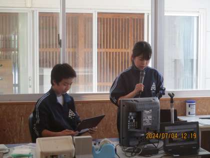 第1回 芝園ラジオ 公開日 2024/07/04 更新日 2024/07/04 芝園の一日 7月4日(木) 給食時 今日は、今年度初めての生徒会執行部主催「芝園ラジオ」を行いました。これは、1年生に「中学校生活での悩みや相談事」などをアンケートして、執行部がそのお悩みに回答するという活動です。DJ風の掛け合いがとてもすてきでした。第2回目が、今から楽しみです!