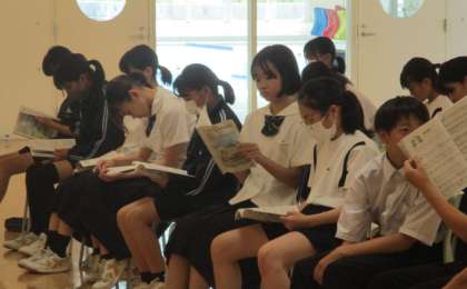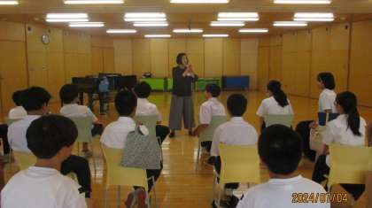 1−Bの音楽の授業風景です。初めての合唱コンクールに向けて、今日から混声三部合唱の練習が始まりました。合唱でしか味わうことのできない楽しさを、味わってほしいと思います。