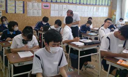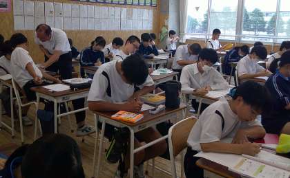 2−Aの数学の授業風景です。これまで学習したことを、プリントや教科書の問題を解いて確認しています。
