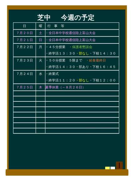 7月22日{月} 今週の予定です。変更があれば、tetoruやHPで連絡します。
