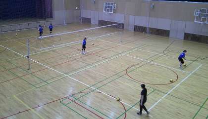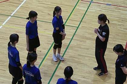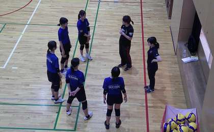 画像は、バレーボール部です。芝園小学校の体育館をお借りして練習しています。部活動指導員の先生や顧問とコミュニケーションを図りながら、活動しています。