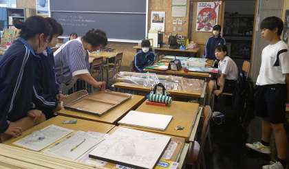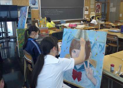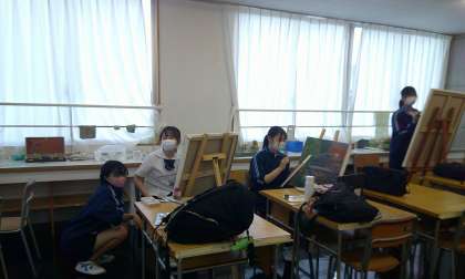 今日の部活動 美術部1 公開日 2024/08/21 更新日 2024/08/21 芝園の一日 8月21日(水) 9:30 美術部の活動の様子です。パネルの取り付け作業の仕方を、先生にレクチャーしてもらっています。
