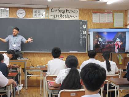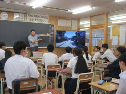 ALTのディーン先生が、夏休みに体験されたことを紹介してくださいました。八尾の町並みが映し出されましたが、生徒は「京都?」「高山?」。ディーン先生は、富山県民以上に八尾のよさを知っておられるようです。