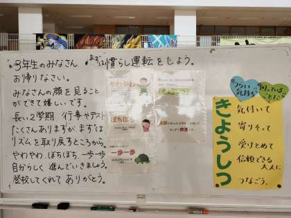 3学年は、2学期スタートの合言葉を「やわやわ、ぼちぼち、一歩一歩」としています。一人一人が自分のペースで順調なスタートが切れることを願ってます。