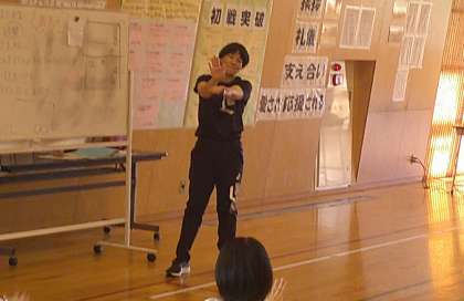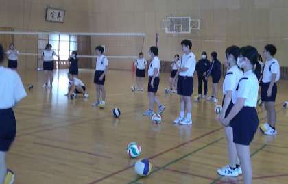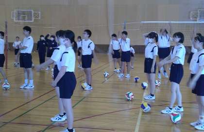 3−Bの体育の授業風景です。バレーボールの学習をしています。今日はアタックの練習。目指せ、アタックNO.1!