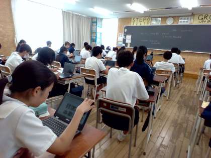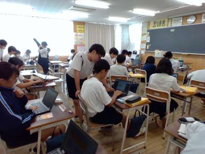 高岡校外学習で学んだことや想い出を新聞にまとめました。班に1台のクロームブックで撮影した写真やイラストなども用いて、思い思いの新聞を作成していました。