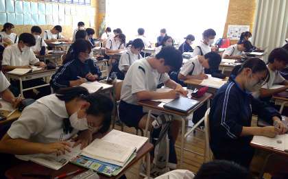 3−Cの国語の授業風景です。「故郷」の学習をしています。当時の中国の文化や歴史に触れながら、登場人物の思いを読み深めています。