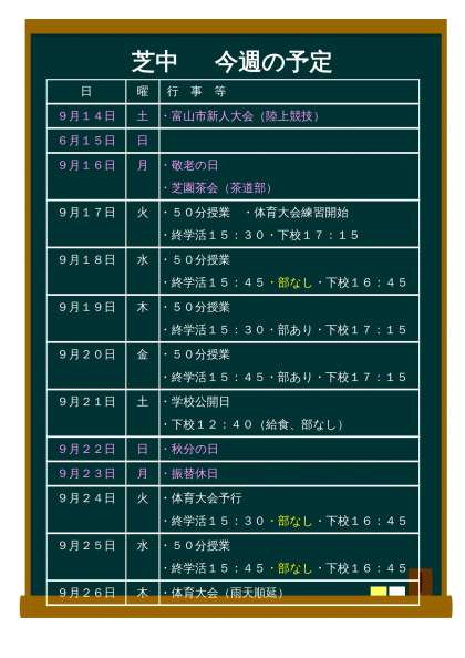 9月13日(金) 来週の予定を掲載します。 変更があればtetoruやHPでお知らせします。