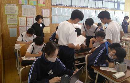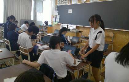 3−Aの家庭科の授業風景です。幼児のおもちゃについて学習をしています。幼児の発達に応じたおもちゃを考えています。