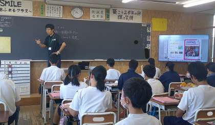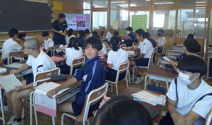 2−Aの英語の授業風景です。ペアになって「富山のオススメの場所は?」と会話をしています。いろんなことを英語で表現できるようになると楽しいですね。