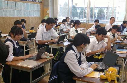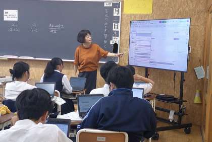 2−Aの家庭科の授業風景です。消費生活の分野を学習しています。端末を使うと、仲間の意見が瞬時に確認できて便利です。
