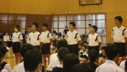 新人大会壮行会 その1 公開日 2024/10/08 更新日 2024/10/08 芝園の一日 10月8日(火) 11日(金)から行われる新人大会に向けて、壮行会を実施しました。1、2年生主体のチームとして初の公式戦です。ちょっぴり緊張気味な、初々しい選手たちです。 【画像 中:野球部、下:陸上競技部】