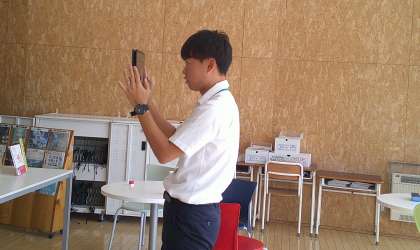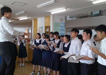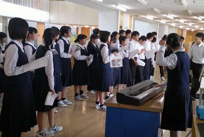 10月9日(水) 3−Bの合唱練習です。「虹」を歌います。先生もビデオ撮りで頑張っています!