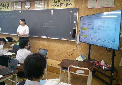 端末を活用して 1−C数学 公開日 2024/10/16 更新日 2024/10/16 芝園の一日 10月16日(水) 1限 1−Cの数学の授業風景です。今日の学習内容や振り返りが端末を使って確認することができます。大事なキーワードが理解できたら色を変えて、自分の授業の理解度を可視化することができます。