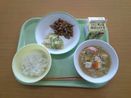 今日の給食 公開日 2024/10/17 更新日 2024/10/17 芝園の一日 10月17日(木) 今日の給食メニューは、 ・ごはん ・牛乳 ・小魚入りフライビーンズ ・白菜なべ ・あわせあえ です。 小魚入りフライビーンズもあわせあえも、噛み応えのあるメニューでとても美味しかったです。