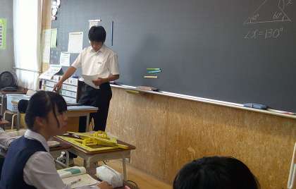 角度を求める 2−A数学 公開日 2024/10/22 更新日 2024/10/22 芝園の一日 10月22日(火) 2限 2−Aの数学の授業風景です。角度を求める問題に挑戦しています。端末を使って、どんな解き方をしたか紹介しています。
