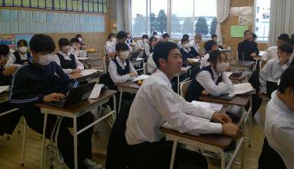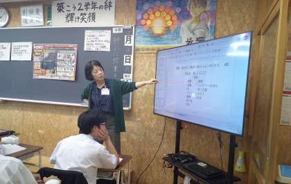 2−Aの家庭科の授業風景です。「商品を購入するときに必要なことは」という課題で、学習をしています。生徒は自分事としてよく考え、意見を交流しています。