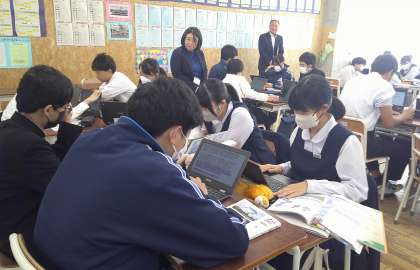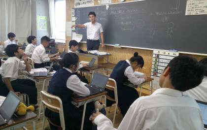 2−Aの理科の授業風景です。今日は浜松市から中学校の先生が授業を見学に来られました。生徒の主体的な学びを深めるため、どのように効果的にICTを活用していくか・・・。これからも研修を進めていきます。