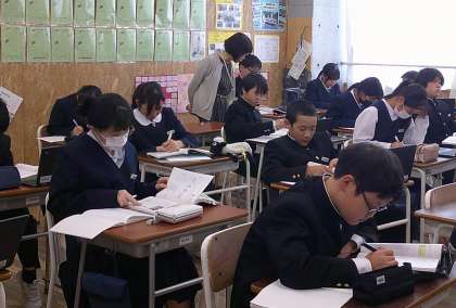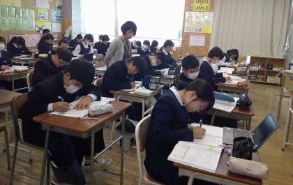 1−Cの数学の授業風景です。反比例のグラフや式について学習しています。ものすごく集中しています!