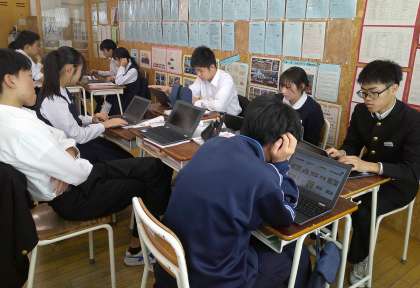 3−Aの英語の授業風景です。「尊敬する人をプレゼンしよう」という課題で学習しています。誰についてプレゼンしようか・・・楽しく悩んでいます。
