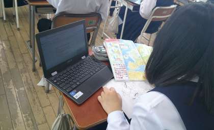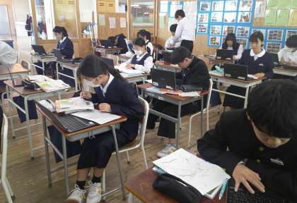 1−Aの社会の授業風景です。ヨーロッパの地形について学習しています。まずは、各自が教科書、地図帳、端末を用いて様々な視点から調べています。調べていくと、また新たな疑問が浮かんでいるようです。