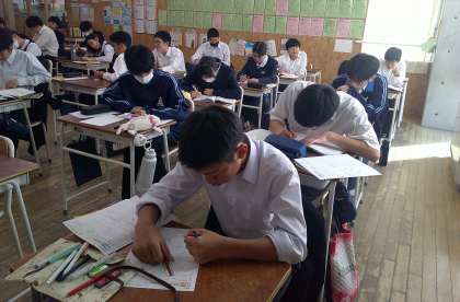 2−Bの数学の授業風景です。各自、問題に挑戦しています。「なんで〜」「う〜ん」と必死に取り組んでいる様子が伝わってきます。