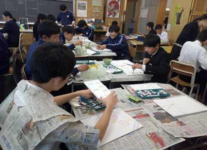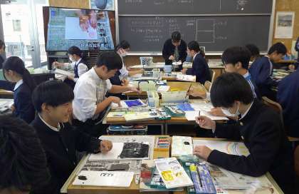モダンテクニックを学ぶ 2−B美術 公開日 2024/11/19 更新日 2024/11/19 芝園の一日 11月19日(火) 2限 2−Bの美術の授業風景です。「バチック」と「スクラッチ」の技法について学習をしています。楽しそうですね。