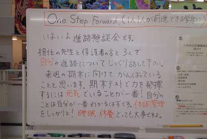 卒業後の進路をどうするか、じっくり考え、自分が決める。先生たちはずっとみんなの応援団です。困ったことがあれば、相談してくださいね。がんばろう、3年生!