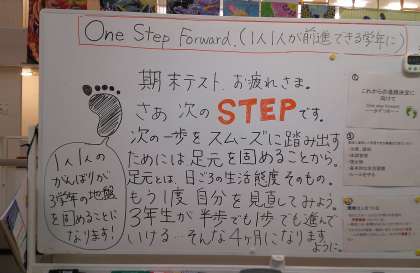 3年のフロアには、学年主任からのメッセージが書かれています。3年生は、これからそれぞれが自分の進路を決定していくことになります。苦しいこともあるかも知れませんが、学年の先生、全員が応援団です。みんなで、一歩ずつ、確実に前進していきましょう。