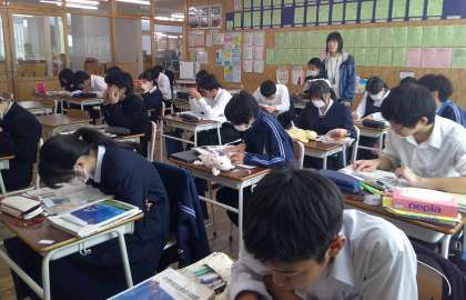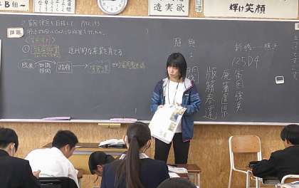 2−Bの社会の授業風景です。富国強兵に向けての政策について学習しています。富岡製糸工場の資料から、様々なことを読みとっています。