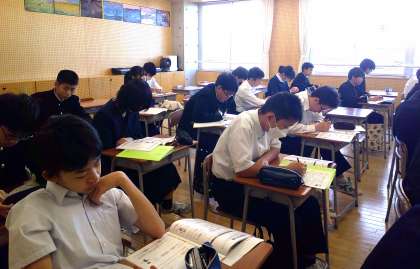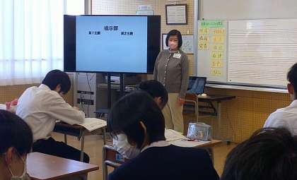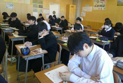 2−Cの音楽の授業風景です。鑑賞の学習をしています。ベートーヴェン作曲「交響曲第5番ハ短調」です。情熱的な表現に聞き入っています。
