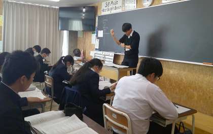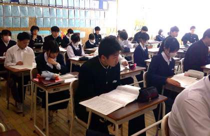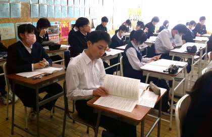 3−Bの英語の授業風景です。期末考査の振り返りをしています。真剣な表情に「さすが、3年生」です。