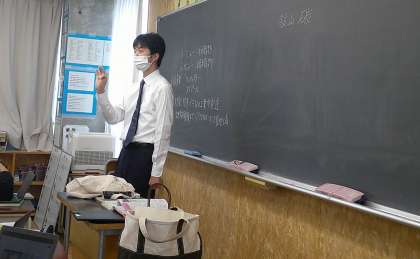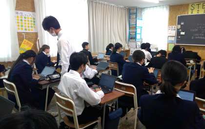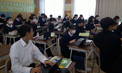 1−Aの社会の授業風景です。ヨーロッパの工業について学習しています。気になることは、地図帳や資料集、端末などで調べています。