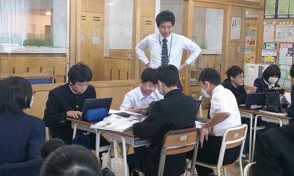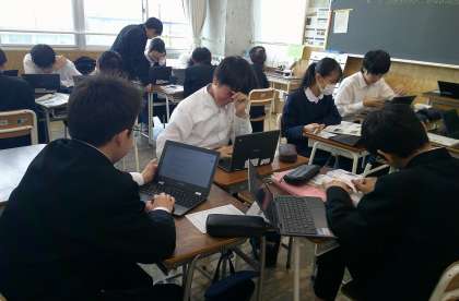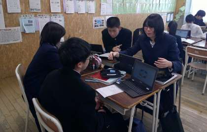 2−Cの理科の授業風景です。「日本の四季」について学習をしています。それぞれの天気の特徴を、気団や風など様々な気象条件をもとにまとめ、分かったことを仲間に伝えています。「それって、どういうこと?」など、自由に意見を交換し合って、考えを深めています。